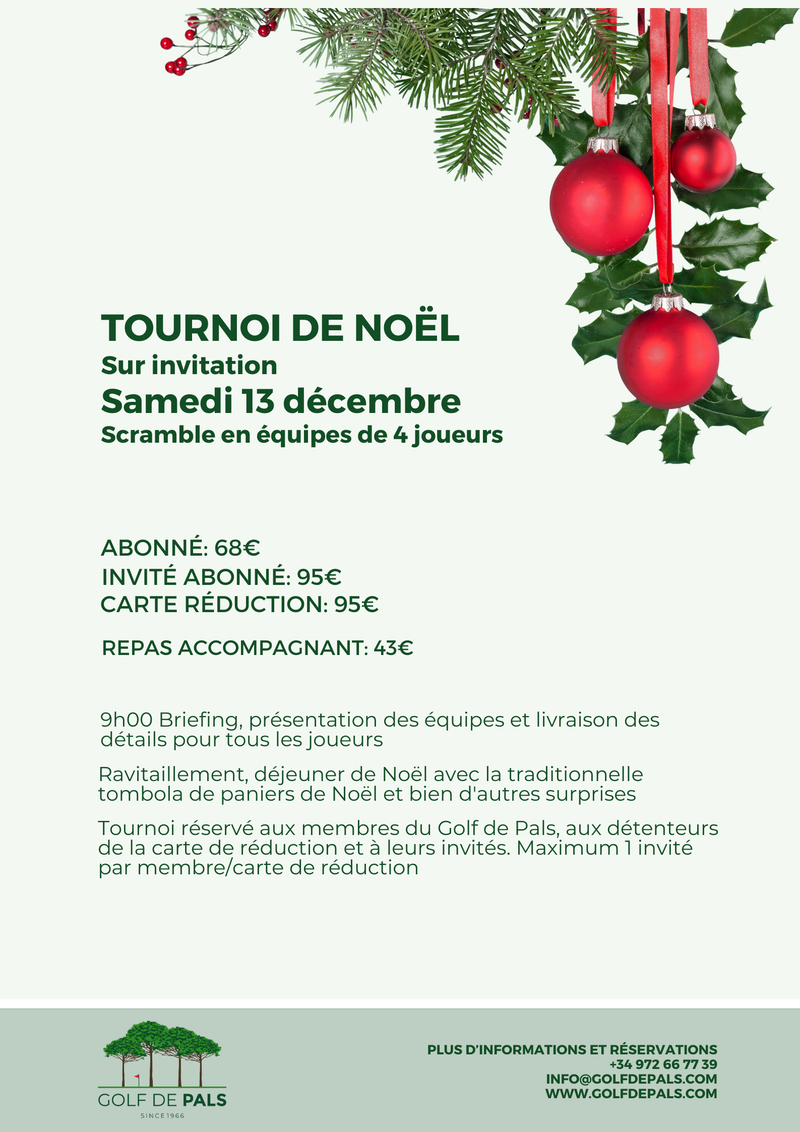 Le tournoi de Noël est réservé aux membres de Golf de Pals / titulaires de la carte de réduction et à leurs invités.